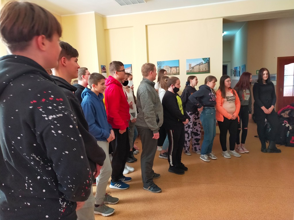 Klasa VIII na lekcji bibliotecznej i wystawie na temat patronów 2021 roku.